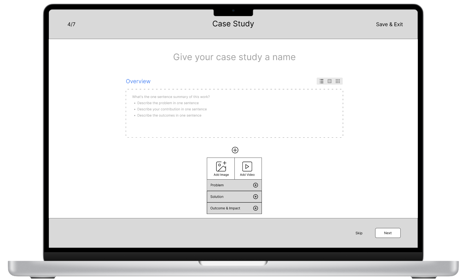 Finally, users begin crafting their first case study. Each section of the case study is broken down into clear steps, with prompts that guide users on what to include. Users can upload header images, provide a name for the case study, add supporting information, and embed files from Figma, Excel, and other tools. This modular approach makes creating case studies feel less overwhelming, while flexible features still allow customization for those who wish to include more details.
