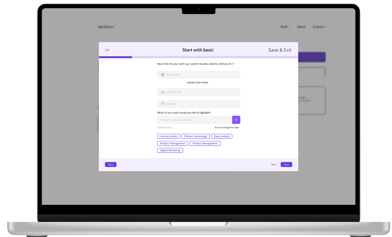The portfolio examples initially caused confusion, as users didn’t realize they were browsing samples. To improve clarity, we implemented a modal overlay for the examples, as well as for all other steps making them distinct yet accessible within the flow of the user’s portfolio page.